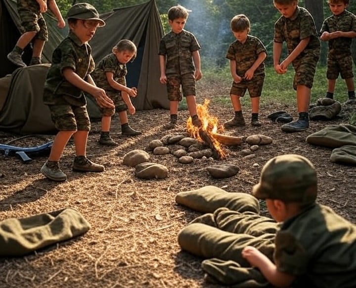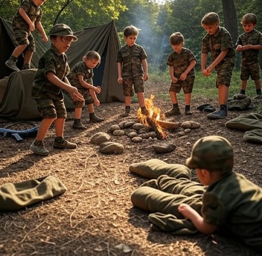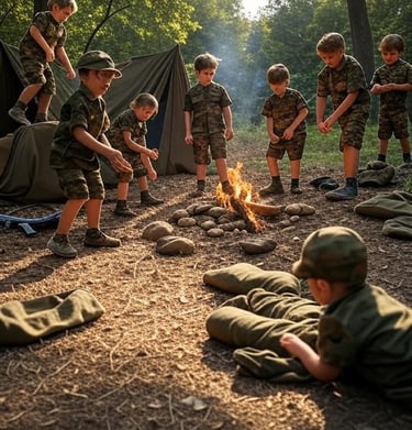 Geen speeltuin met zachte matten, maar een veld vol uitdagingen. Kinderen leren hier vuur maken, marcheren in de regen en onderhandelen over wie de laatste droge sok krijgt. Speelgoed? We hebben stenen, takken en de wil om te overleven.